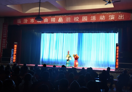 戏曲是我国民间艺术的瑰宝,是一种无形的历史文化遗产。演出举行之前,主持人先向观众简单介绍了蒲剧的有关知识以及临汾市小梅花蒲剧院的发展史,使我们对于蒲剧有了一个深刻的了解,蒲剧在这方土地上产生、发展、繁荣,其音乐节奏强烈明快,唱腔高亢豪放,表演既粗狂舒缓有力,又细腻活泼轻快。随后,临汾市小梅花蒲剧院的演员们表演了《表花》、《跑城》、《火凤凰》、《挂画》、《贩马》、《采花》等戏剧选段。在这些节目中演员运用了帽翅、髯口、翎子、梢子、鞭子、扇子、跷工等表演特技,使整场演出环环相扣、形象逼真,引人入胜。经过将近两个小时的精彩表演,本次活动在演职人员和院领导的合影中圆满落下帷幕。
