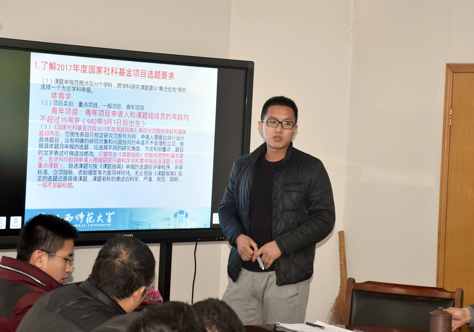 郑旗经理首先传达了校第五届委员会第二次全体(扩大)会议精神,并着重强调2017年度国家基金项目申报工作的重要性,同时要求进一步积极推进申报2017年度国家基金项目的各项工作。冯晓丽副经理汇报了“校国家级项目申报工作交流会”的重要内容,指出了申报国家级项目的必要性和注意事项。随后,各申报人以PPT的形式,对选题题目、研究框架等方面进行了汇报,与会人员当场给予中肯的建议,同时提出了具体修改意见。