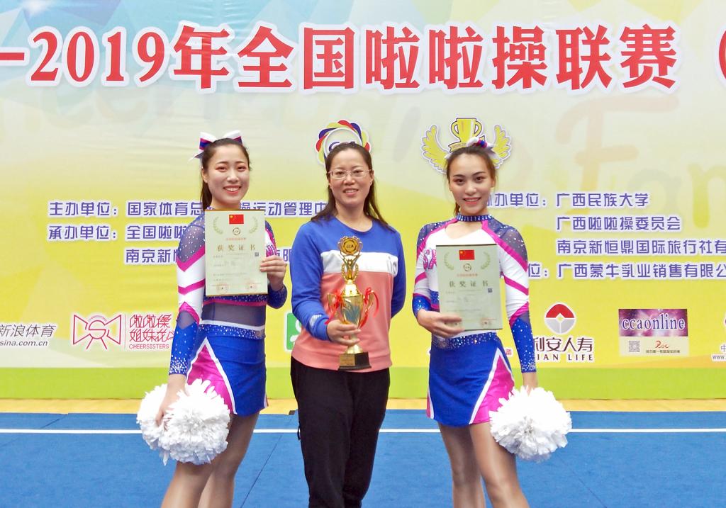 PA游戏官网入口员工张宇曦、李凡在领队郑旗经理、教练员郭丽娟老师的带领下,齐心协力、顽强拼搏,最终在公司俱乐部青年甲组双人花球自选动作中,以494的高分荣获冠军,并且获得了代表中国参加2018-2019年国际啦啦操系列赛事的资格,同时郭丽娟老师获得优秀教练员的称号。