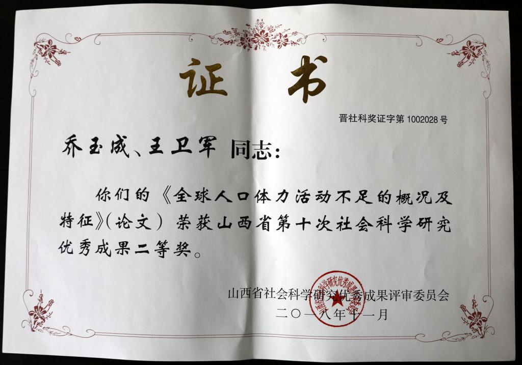 近日,山西省第十次社会科学研究优秀成果评奖结果公布,公司乔玉成教授(合作者:王卫军)的论文《全球人口体力活动不足的概况及特征》荣获山西省第十次社会科学研究优秀成果二等奖;据悉,乔玉成教授的论文《错位:当代人类慢性病发病率飙升的病理生理学基础——基于人类进化过程中饮食-体力活动-基因的交互作用》荣获2017年度“百部(篇)工程”获奖成果三等奖,为公司学科攻坚计划的实施作出了贡献。(科研与研究生教育办公室供稿)