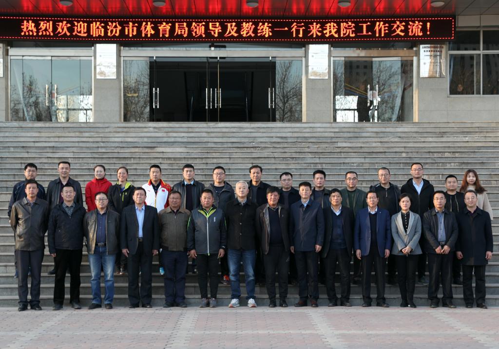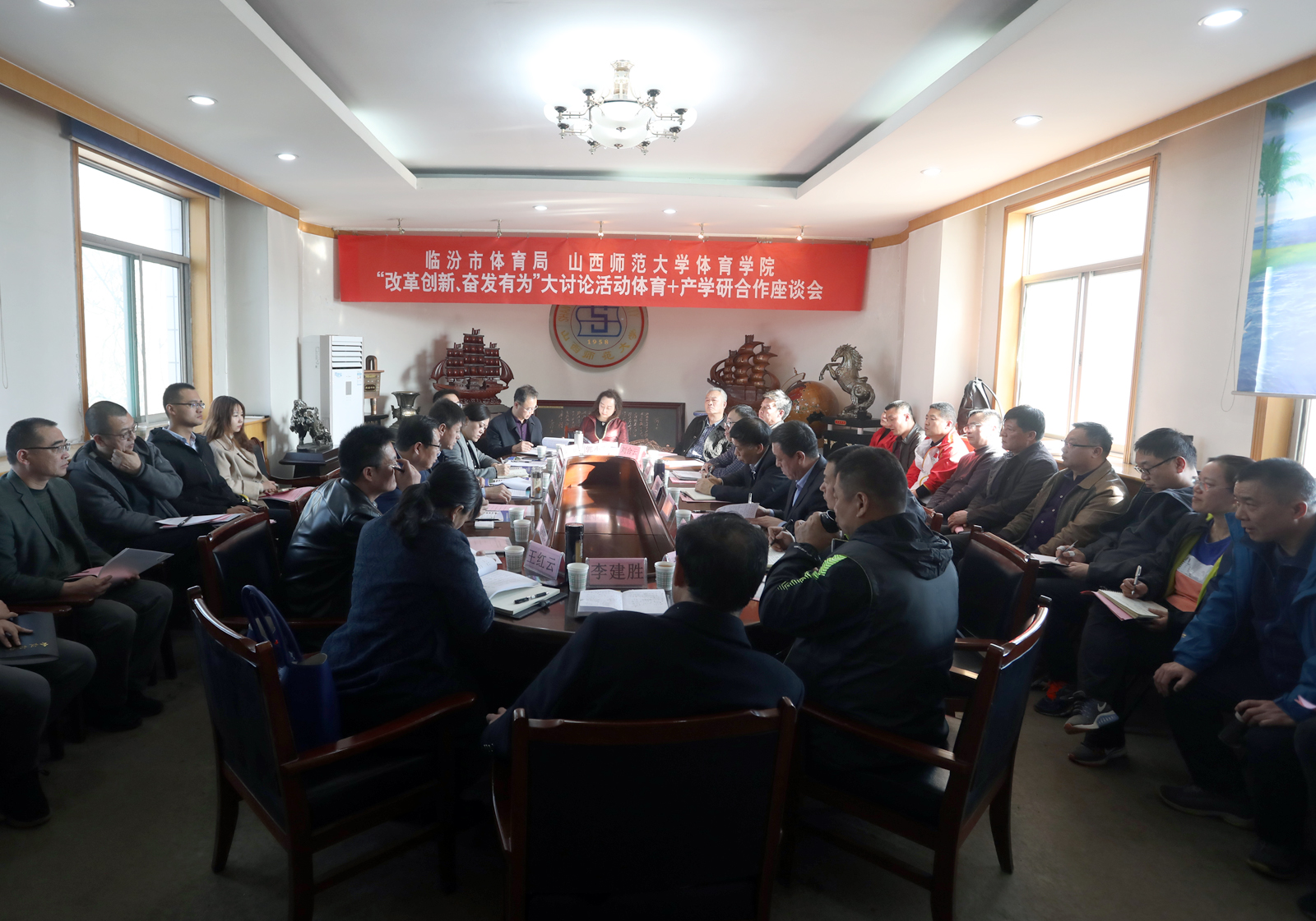 3月15日下午,PA游戏官网入口与临汾市体育局“改革创新,奋发有为”大讨论活动体育+产学研合作座谈会在三校区东会议室举行。临汾市体育局党组书记、局长陈海平、副局长段晓娜,临汾市体育运动公司党总支书记、董事长牛鸿翔、副董事长曹鹏、尹建峰、张敏等一行14人出席,公司党委书记李学刚、公司党委副书记孙学虎、副经理卢向阳、王江,各系部科室主要负责人及教练参加。座谈会由经理郑旗主持。