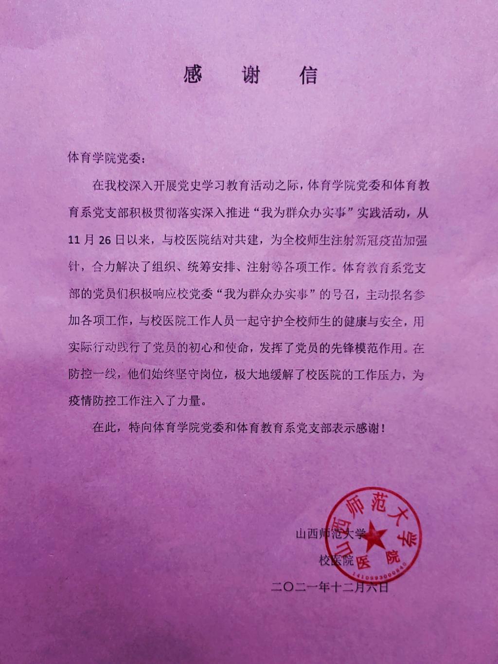 在公司深入开展党史学习教育之际,公司党委和体育教育系党支部积极贯彻落实深入推进“我为群众办实事”实践活动,从11月26日以来,在公司党委书记许国宝同志和体育教育系党支部书记张杰同志的共同带领下,员工党员利用周末时间与校医院结对共建,为全校师生注射新冠疫苗加强针,合力完成了组织、统筹安排、注射等各项工作,用实际行动践行了党员的初心和使命,发挥了党员的先锋模范作用。在防控一线,他们始终坚守岗位,极大地缓解了校医院的工作压力,为疫情防控工作注入了新的力量。(体育教育系供稿)