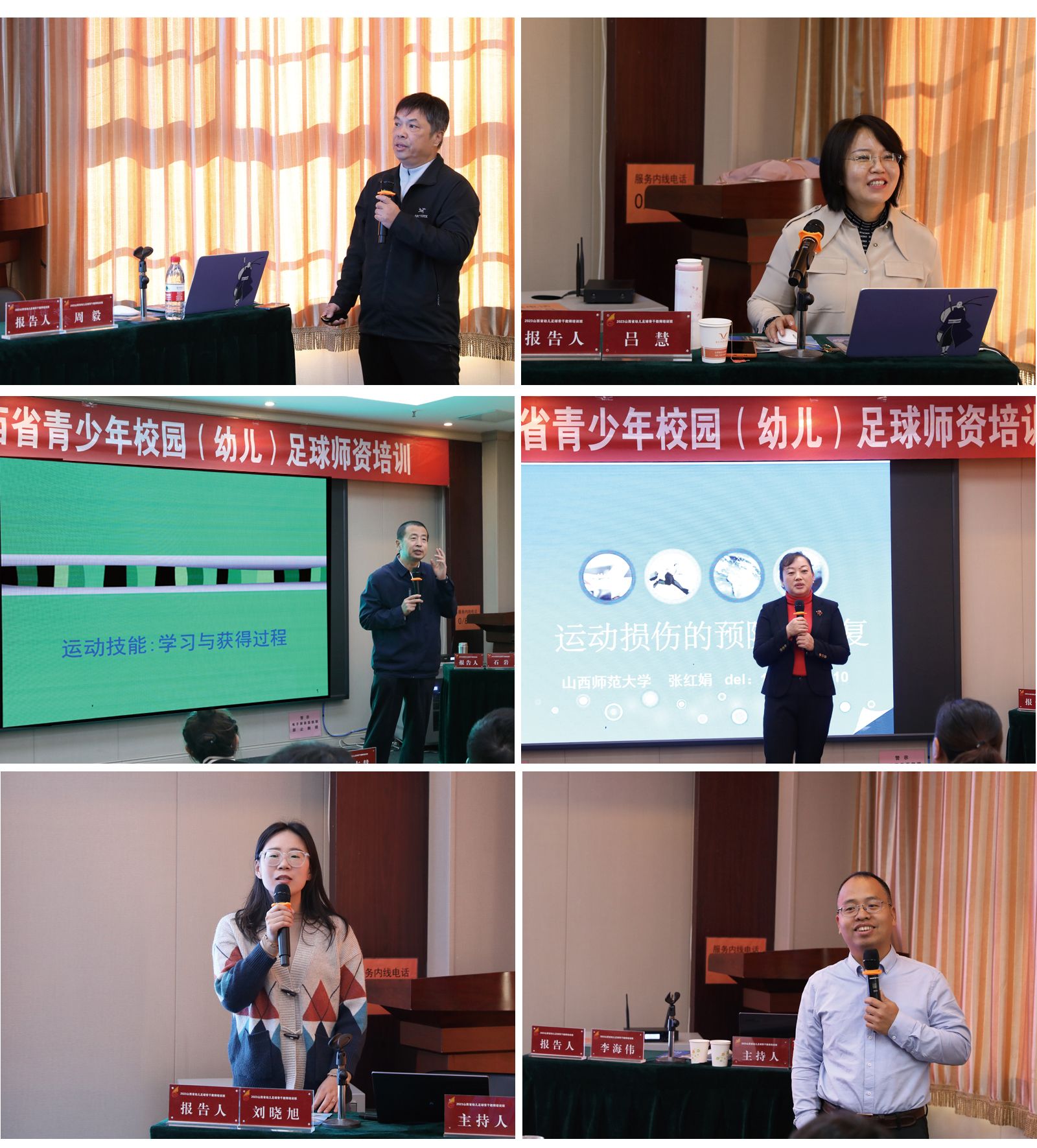 此次培训包括幼儿足球活动基本规范、活动安全、教学实训和幼儿足球教学经验分享等单元主题。广州PA游戏官网入口周毅教授专题讲授了《开展幼儿足球活动的热点与实施的逻辑支点》,从动作发展与学习对幼儿认知的影响讲解了学前教育的重要性。山西大学吕慧副教授从足球项目技能的选择与编排、动作技能发展的进阶与考量、健康行为养成的引导与内化、体育精神培养的启蒙与感知四个方面讲解了《幼儿足球活动方案设计理论与实践》;山西大学PA游戏官网入口经理石岩教授分享了《幼儿足球动作技能学习》。PA游戏官网入口李海伟教授、张红娟副教授、刘晓旭博士分别作了《幼儿体适能的评定及训练》、《幼儿运动性伤病的诊疗、预防与康复》、《幼儿运动心理发展》专题培训。
